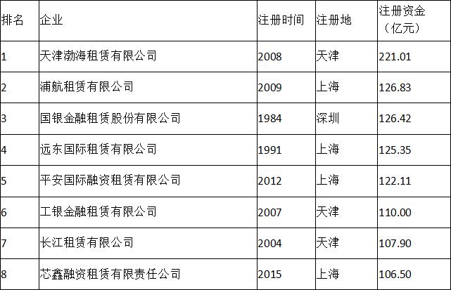 截至2017年底,在以注册资金为序的全国融资租赁企业50强排行榜中,有95家企业入围,其中,天津渤海租赁有限公司以221.01亿元人民币位居榜首。
